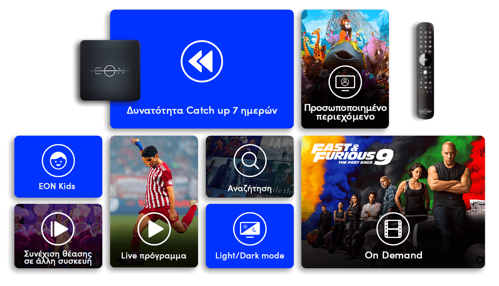Με την ΕΟΝ, κάθε τηλεόραση μετατρέπεται σε Smart TV. Παρακολούθηση του αγαπημένου σου προγράμματος με δυνατότητα Catch up 7 ημερών, επιλογή ανάμεσα σε 3000 τίτλους On Demand, διακοπή και συνέχιση θέασης σε οποιαδήποτε συσκευή, είναι μερικές μόνο από τις λειτουργίες της ΕΟΝ. Ακόμα και τα παιδιά έχουν τον δικό τους ασφαλή χώρο διασκέδασης, με το EON kids.